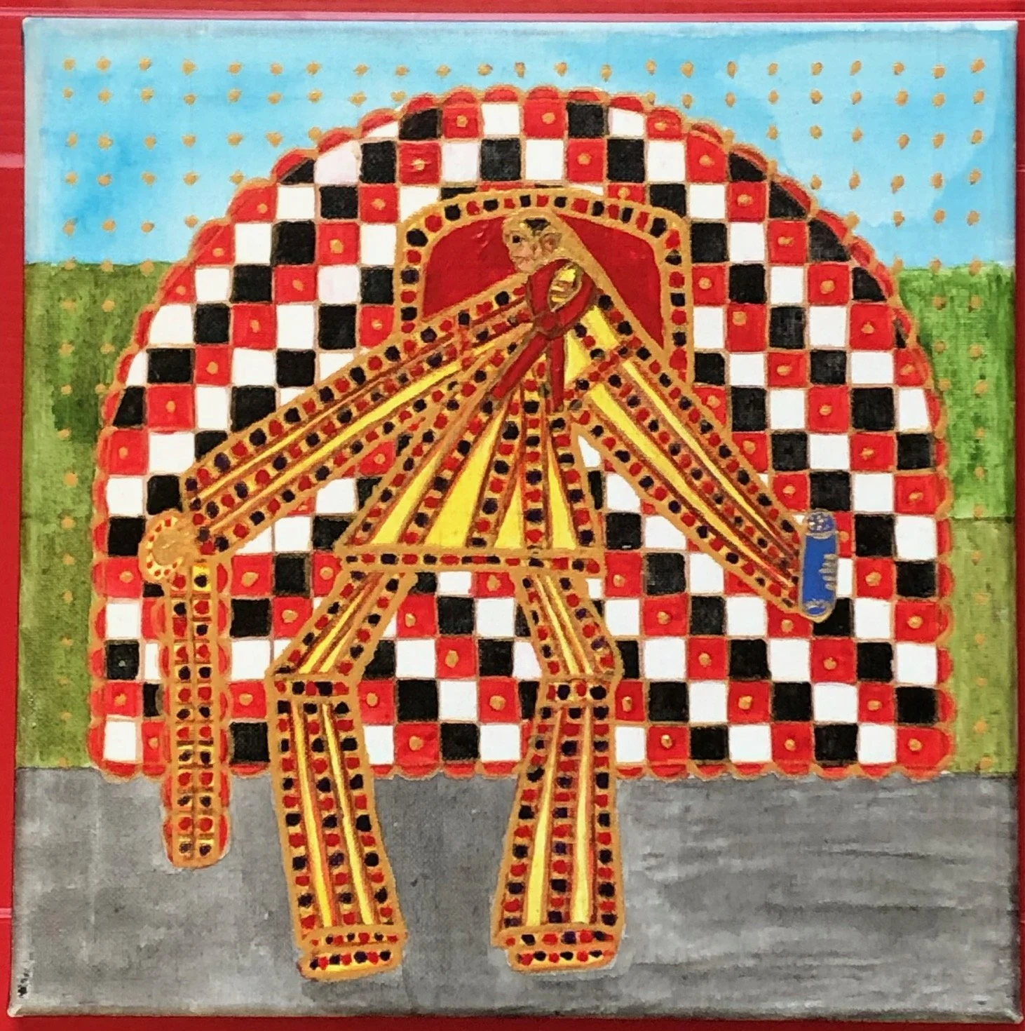 ‘A Whirling Dervish’ 2022 – Multi-coloured & gold acrylic paints on canvas 12” circle $500 USD