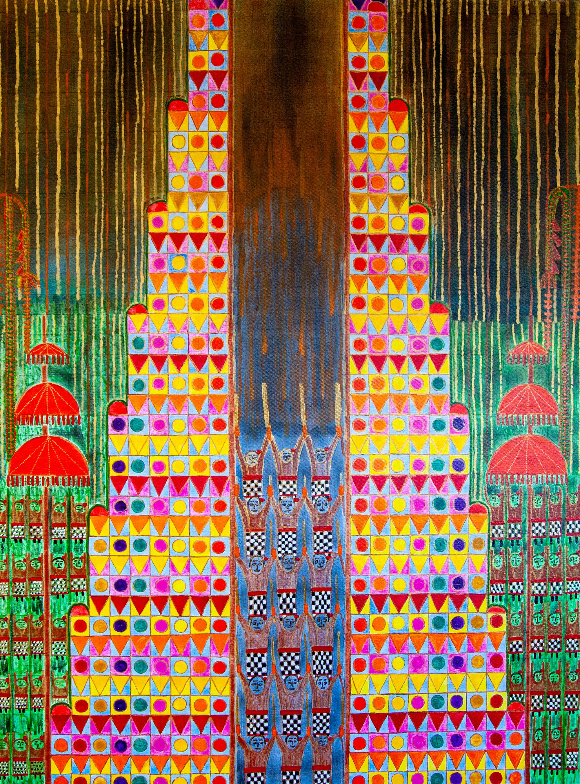 (4) Candi Bentar: A classical Balinese Gateway commonly found at the entrance of religious compounds in Indonesia. A Candi structure refers to its stone or brick construction, candi bentar means such a structure is split perfectly into two, both halves symmetrical and has a passage in the center for people to walk through. I painted this with a multicolored Modern Art background for a Kecak Fire and Trance Dance. There are no musical instruments that accompany the whole performance. The dance is accompanied by a chorus from the dancers. The Kecak Dance is typically performed by 50 to 100 men wearing only loin cloths and their upper bodies are left bare.